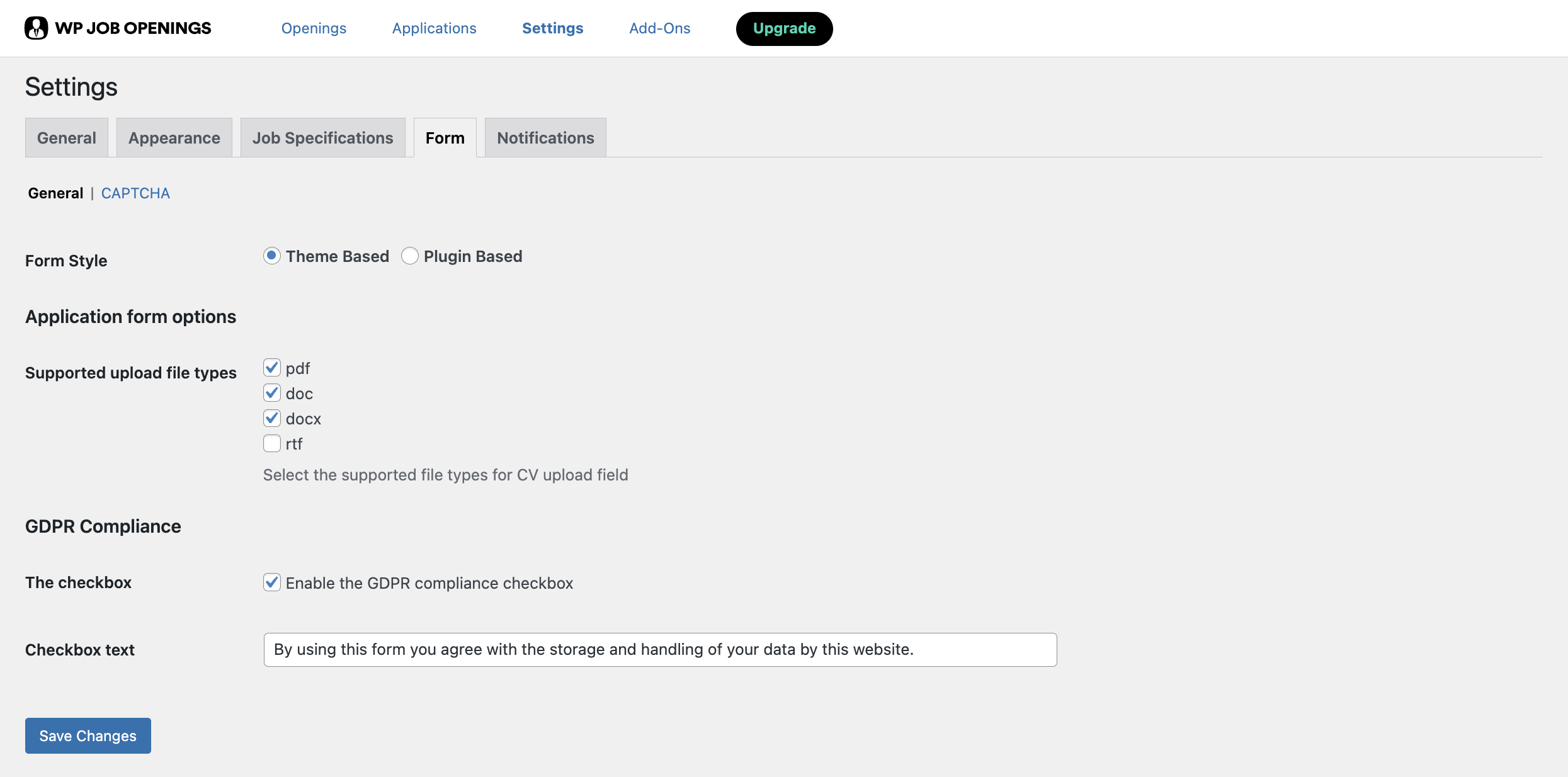 * **Supported Upload File Types :** The plugin supports PDF, Doc, Docx, and Rtf formats.